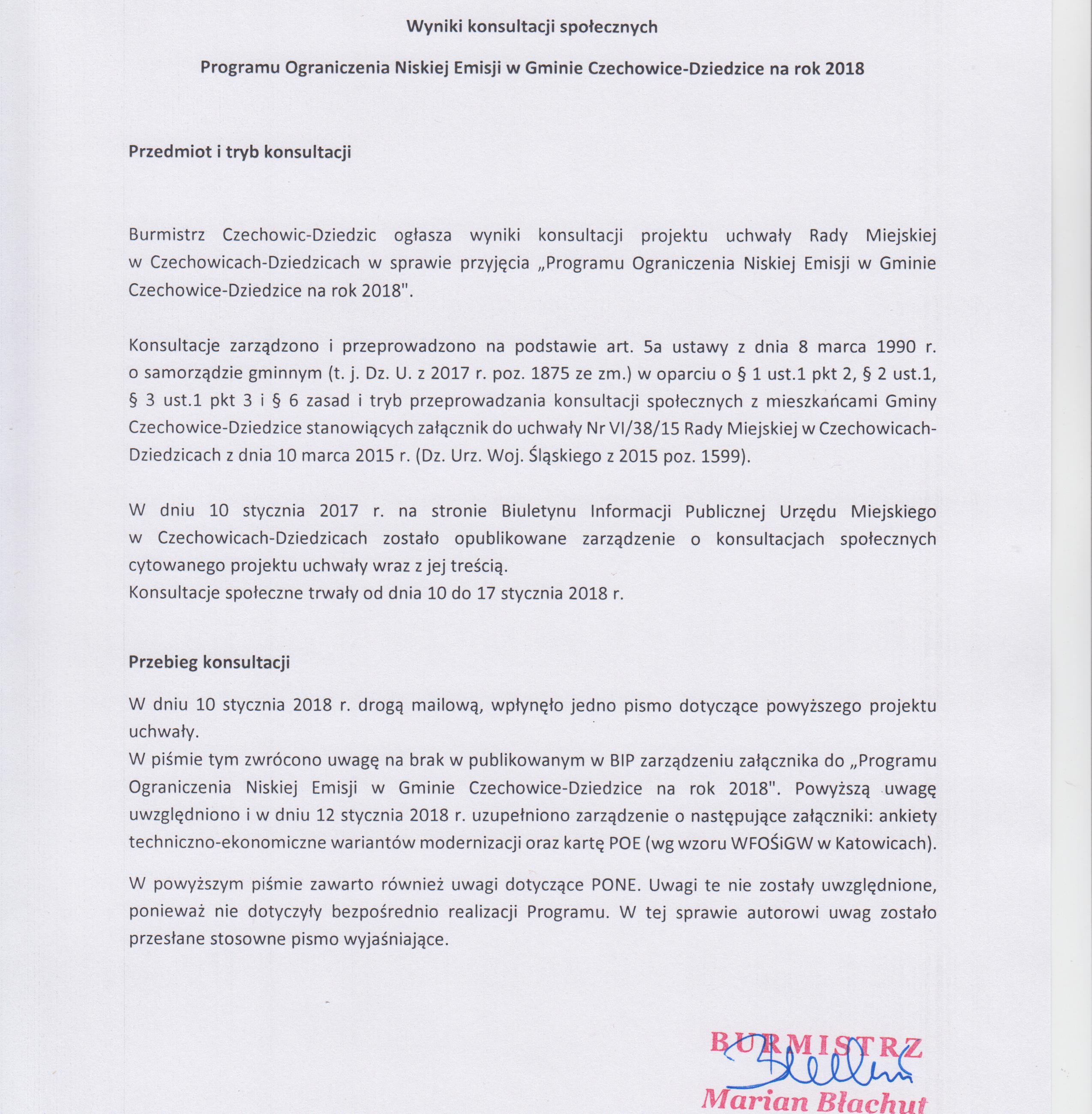 Konsultacje dotyczące projektu uchwały Rady Miejskiej w Czechowicach-Dziedzicach w sprawie przyjęcia "Programu Ograniczenia Niskiej Emisji w Gminie Czechowice-Dziedzice na rok 2018"